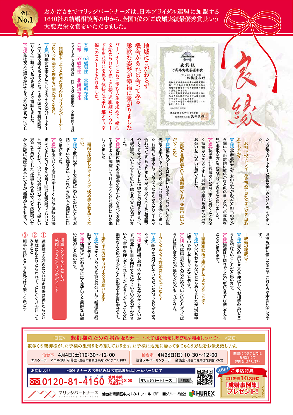 仙台発・大人の情報誌「 りらく 」2020年4月号に弊社の活動内容が掲載されております。現在、結婚に向けて活動をされている方、これから婚活を始められる方に向けた体験談の記事となっております。ぜひ参考にしてください。
