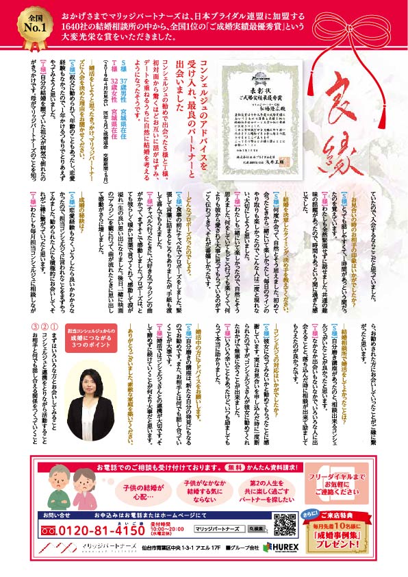 仙台発・大人の情報誌「 りらく 」2020年5月号に弊社の活動内容が掲載されております。現在、結婚に向けて活動をされている方、これから婚活を始められる方に向けた体験談の記事となっております。ぜひ参考にしてください。